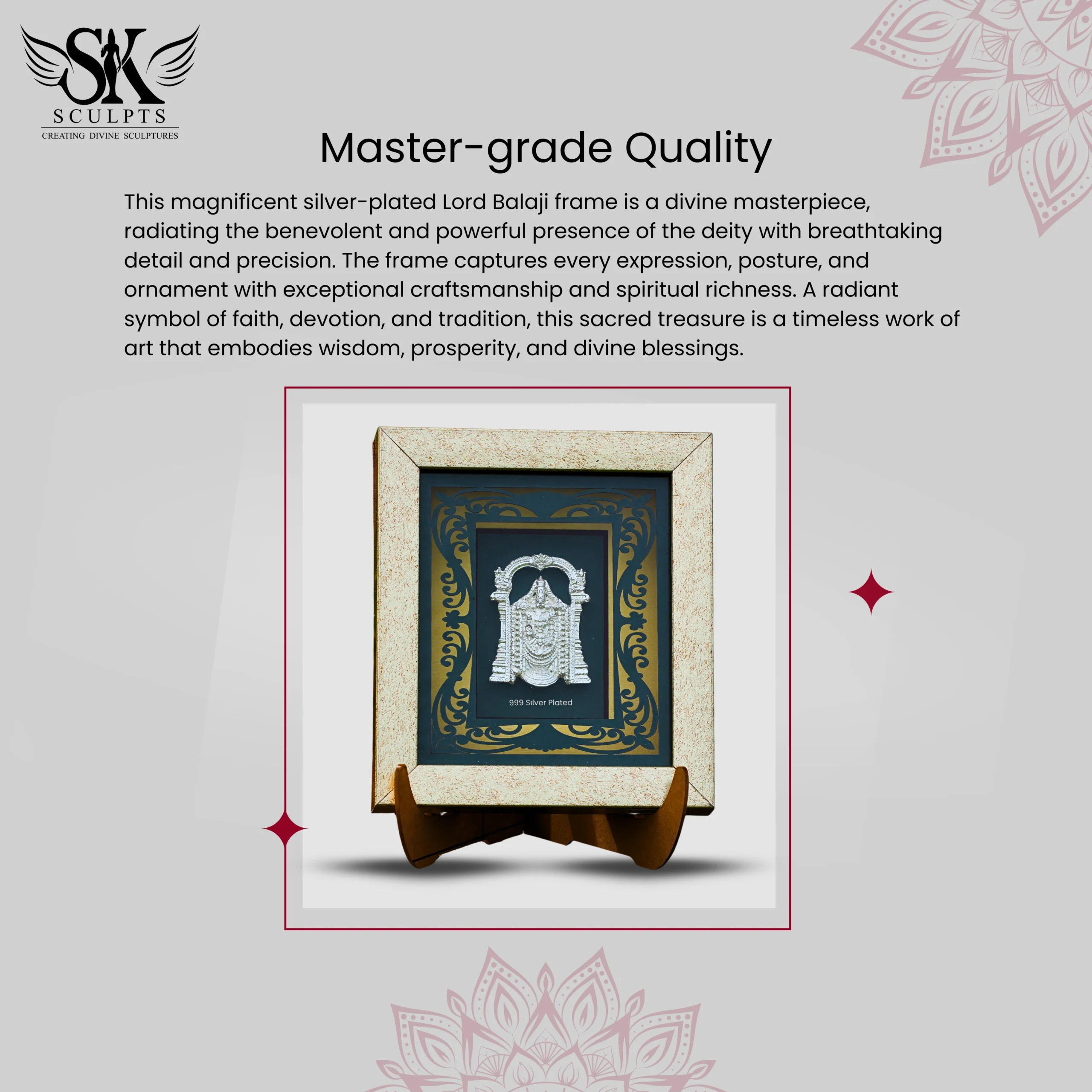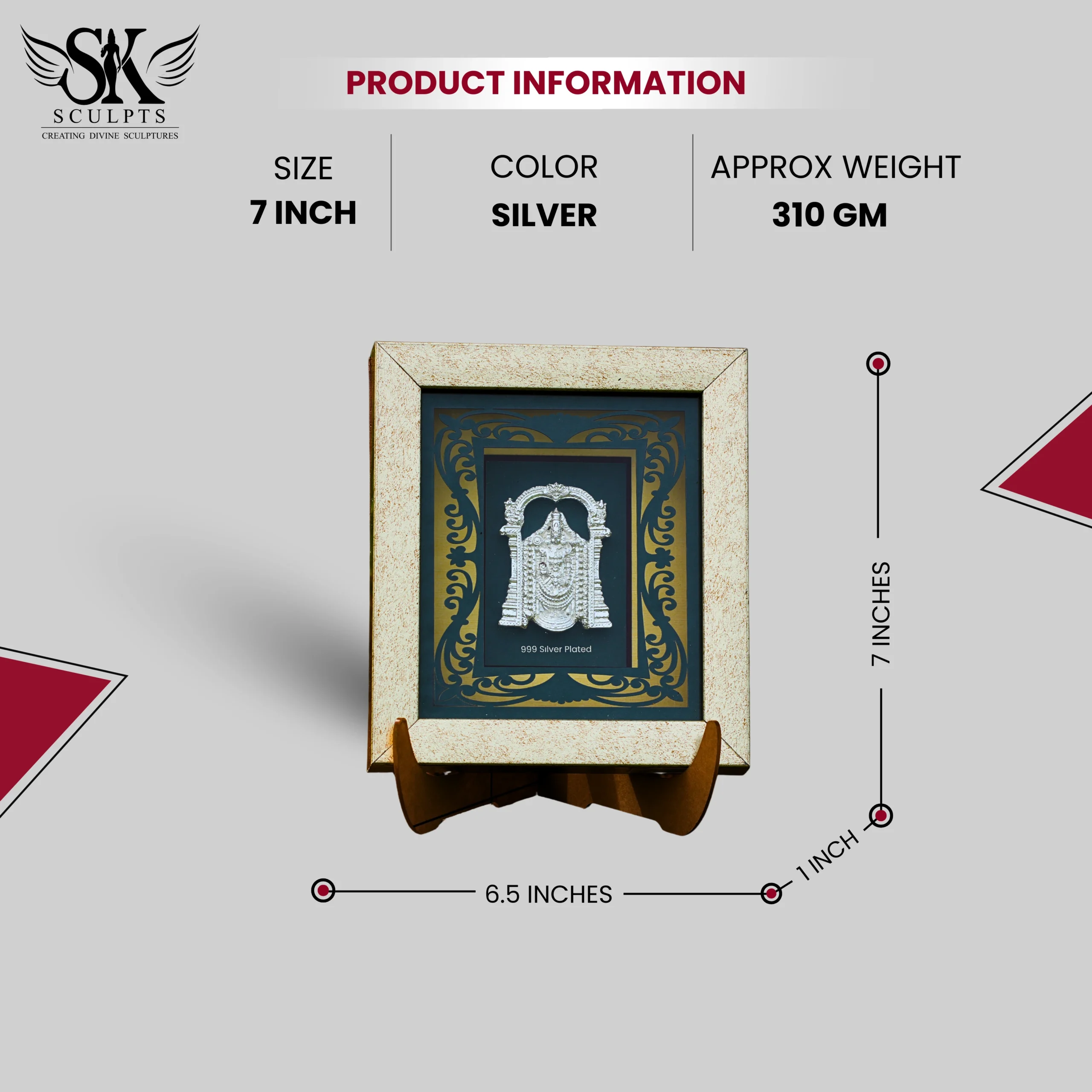This magnificent silver-plated Lord Balaji frame is a divine masterpiece, radiating the benevolent and powerful presence of the deity with breathtaking detail and precision. The frame captures every expression, posture, and ornament with exceptional craftsmanship and spiritual richness. A radiant symbol of faith, devotion, and tradition, this sacred treasure is a timeless work of art that embodies wisdom, prosperity, and divine blessings.