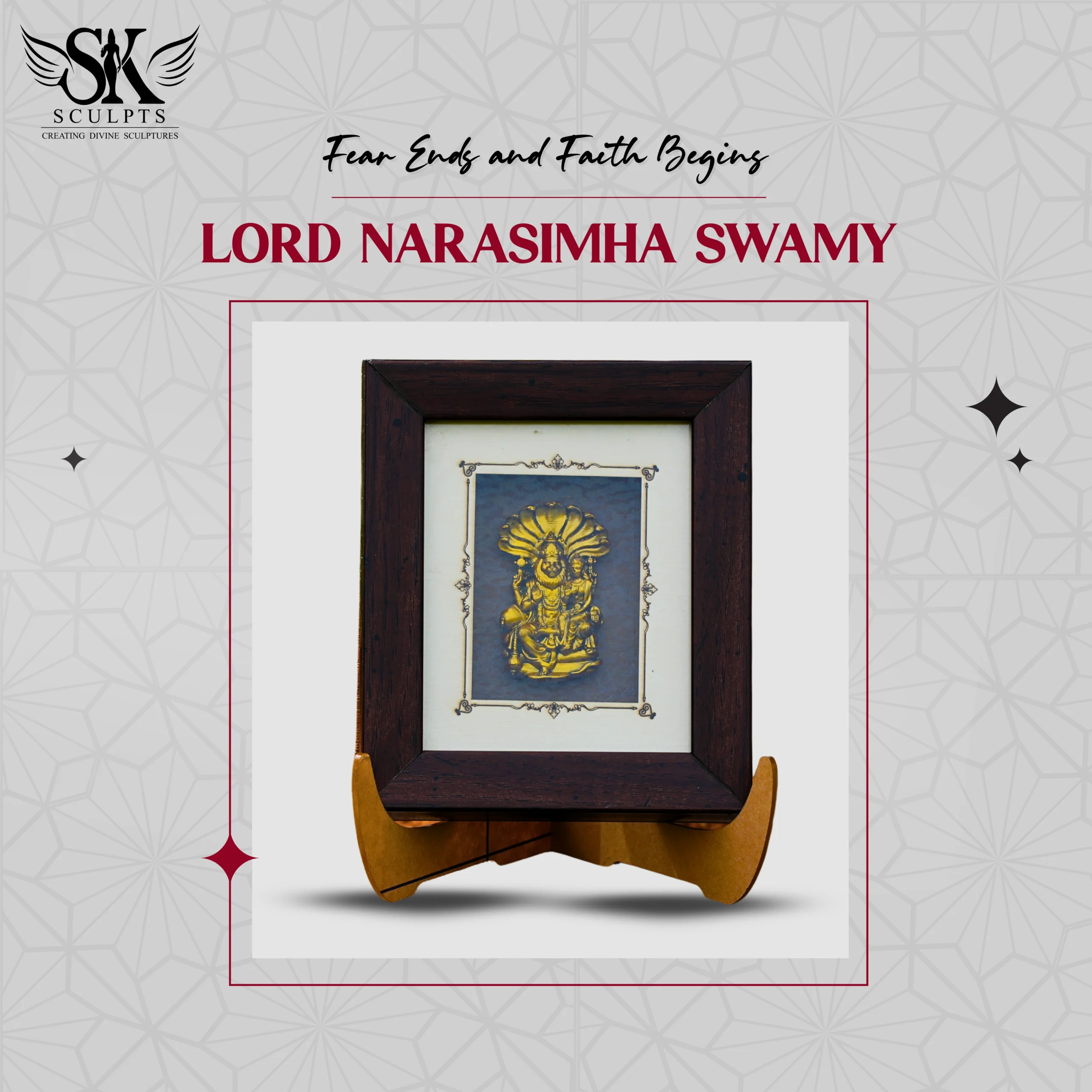 Invite divine protection and blessings into your home with the fierce grace of Lord Narasimha Swamy. This beautifully crafted frame captures the powerful presence and spiritual might of the Lord, reflecting every divine detail with artistic brilliance. A symbol of unwavering devotion, courage, and protection, it brings the sacred essence of Narasimha’s divine avatar into your space, a true tribute to India’s rich spiritual heritage.